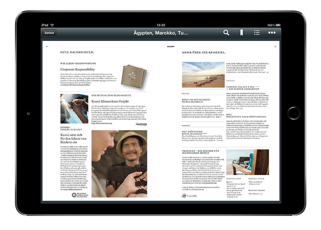 Es steht eine Auswahl diverser Kataloge zur Verfügung. Durch einfaches Blättern und eine direkte Kapitelauswahl wird das Durchstöbern der Reisedestinationen besonders benutzerfreundlich gestaltet. Dank einer eingebundenen Skalierung verfügt die Applikation auch bei Vergrösserung über eine ausgezeichnete Bildqualität.
