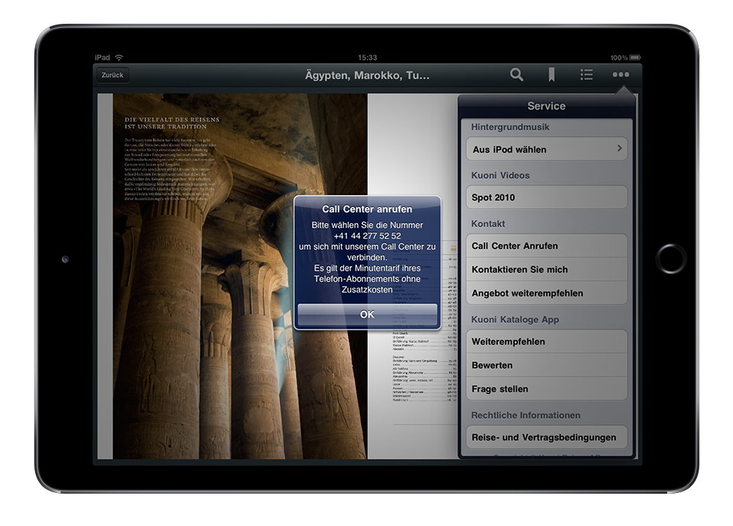 Der bekannte Reiseveranstalter Kuoni will seinen Kunden einen neuen Zugang zu seinem Angebot eröffnen. Eine fürs iPad optimierte Anwendung soll ein vom Medium Tablet und dessen Eigenschaften ausgehendes Benutzererlebnis bieten, das den Anwendungskontext berücksichtigt.